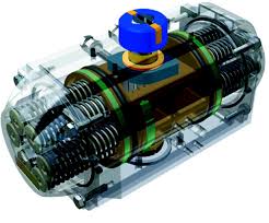 - Реечная передача с двумя поршнями для получения компактной конструкции, большей долговечности и быстроты работы. Вращение в обратную сторону обеспечивается простой перестановкой поршней.